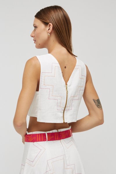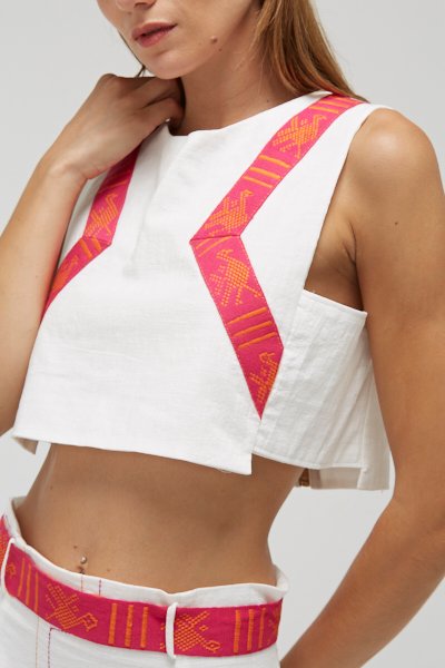 Chumbi Top: Elaborado en 100% algodón lino cotton. Bordado artesanal, aplicaciones de chumbi telado a mano. Cierre desmontable. Uso por ambos lados.