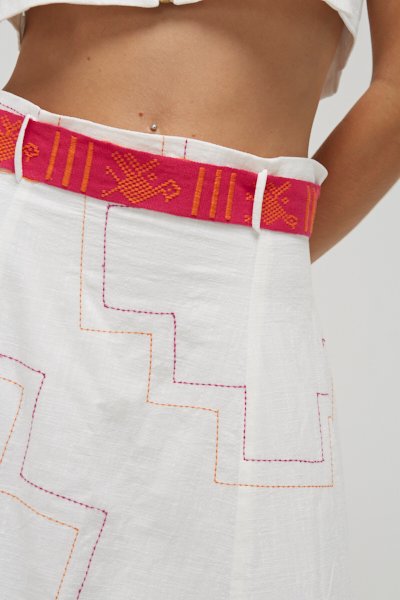 Chumbi Skirt: Elaborado en 100% algodón lino cotton. Bordado artesanal, aplicaciones de chumbi telado a mano. Cierre posterior.