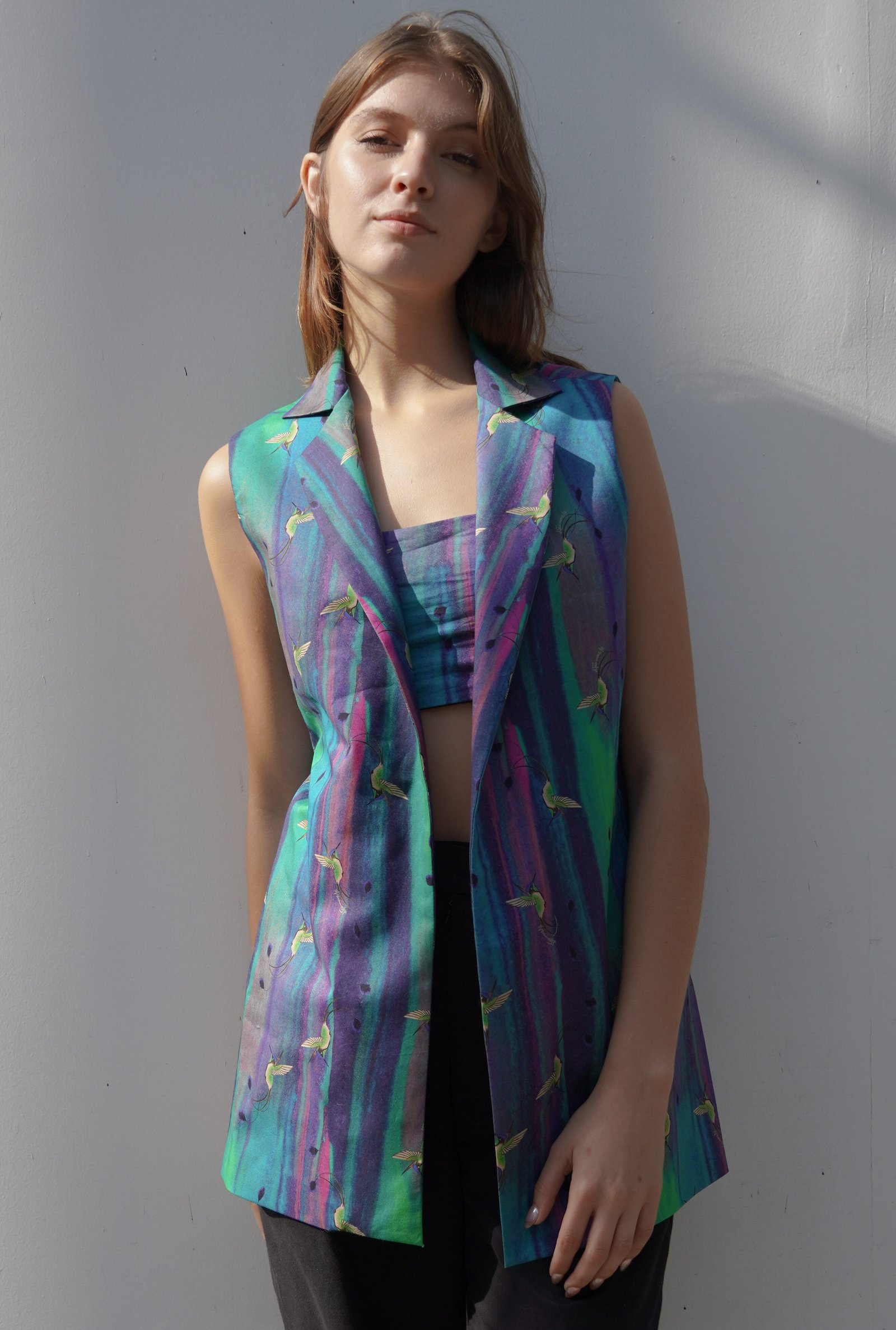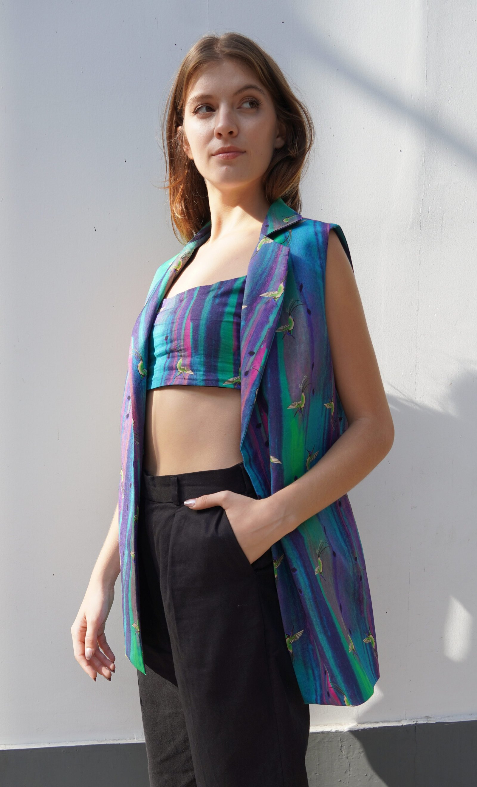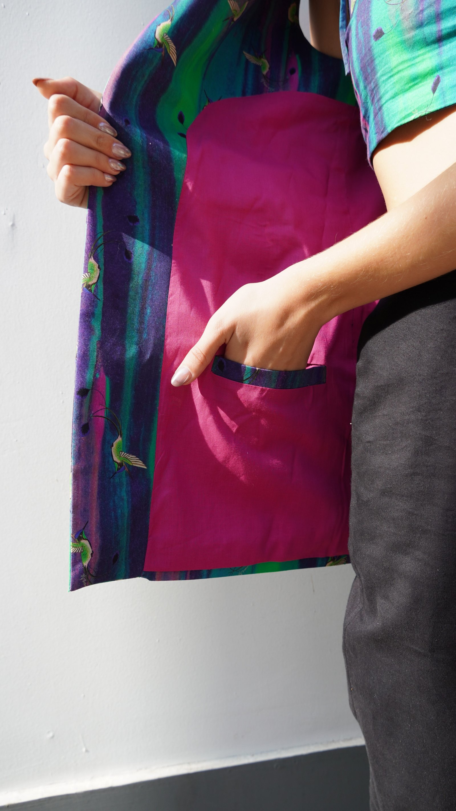 Elaborado en 100% algodón (-3% elastano), forro interno 100% algodón nanzu. Bolsillo interior, entretelado al 100%.