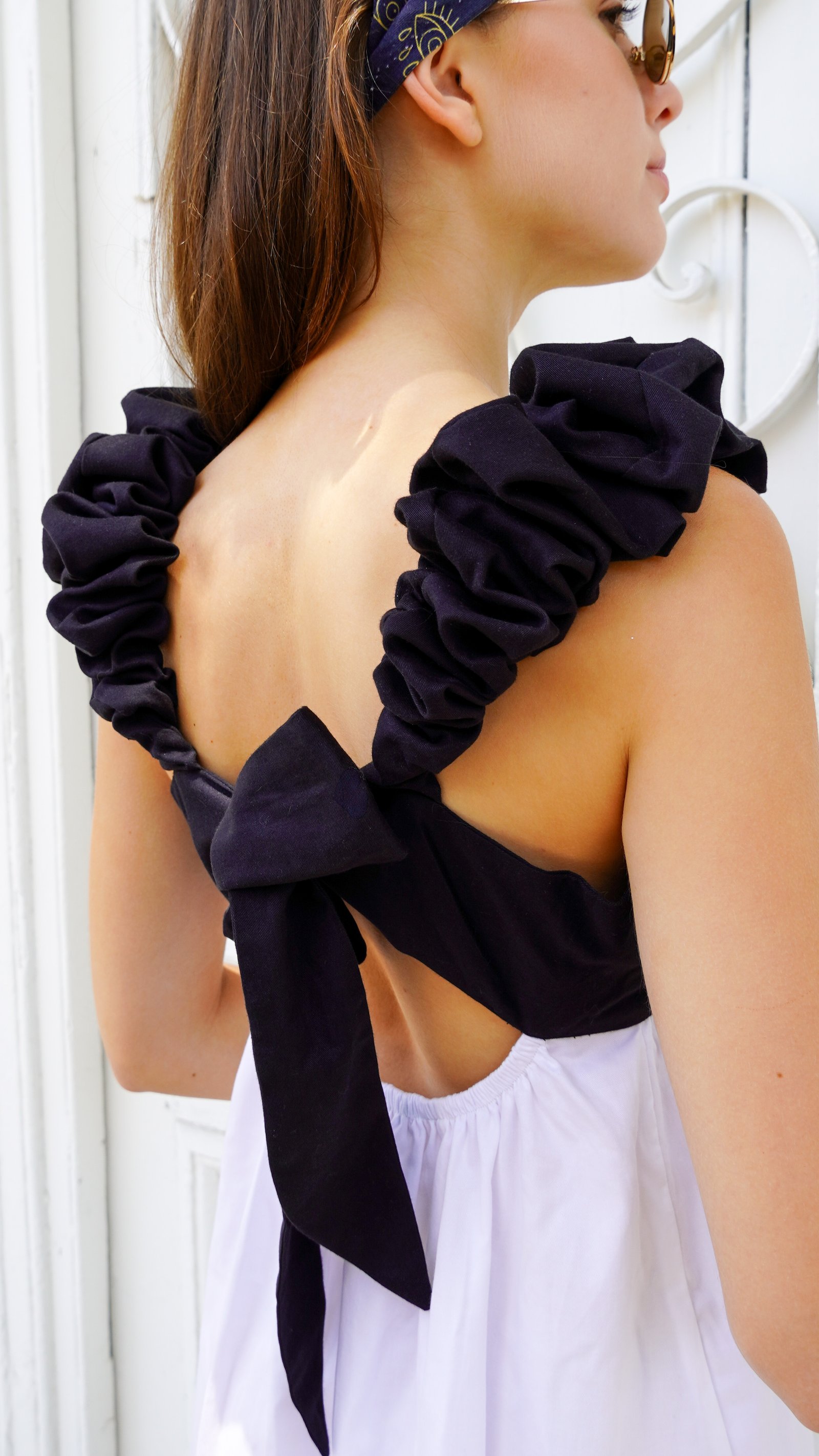 Elaborado en 100% algodón, corte imperio sin mangas, tiras elastizadas, amarre posterior en la misma tela. Mezcla de tonalidades negro, ivory y ecru.